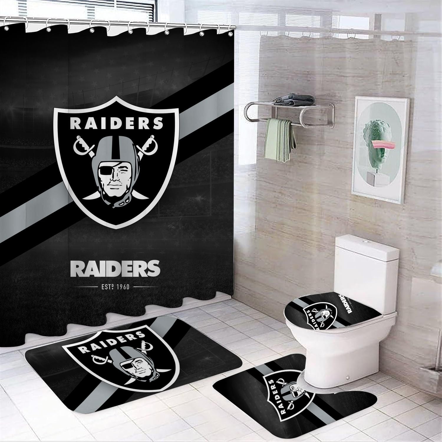 Time to refresh your bathroom with this Oakland Raiders shower curtain, with this football bathroom decor, that will offer you a cherry smile. Bring this black white football sport team flag print pattern decor shower curtain to your bathroom, let you and your get the most comfortable relax feeling at bathing time.