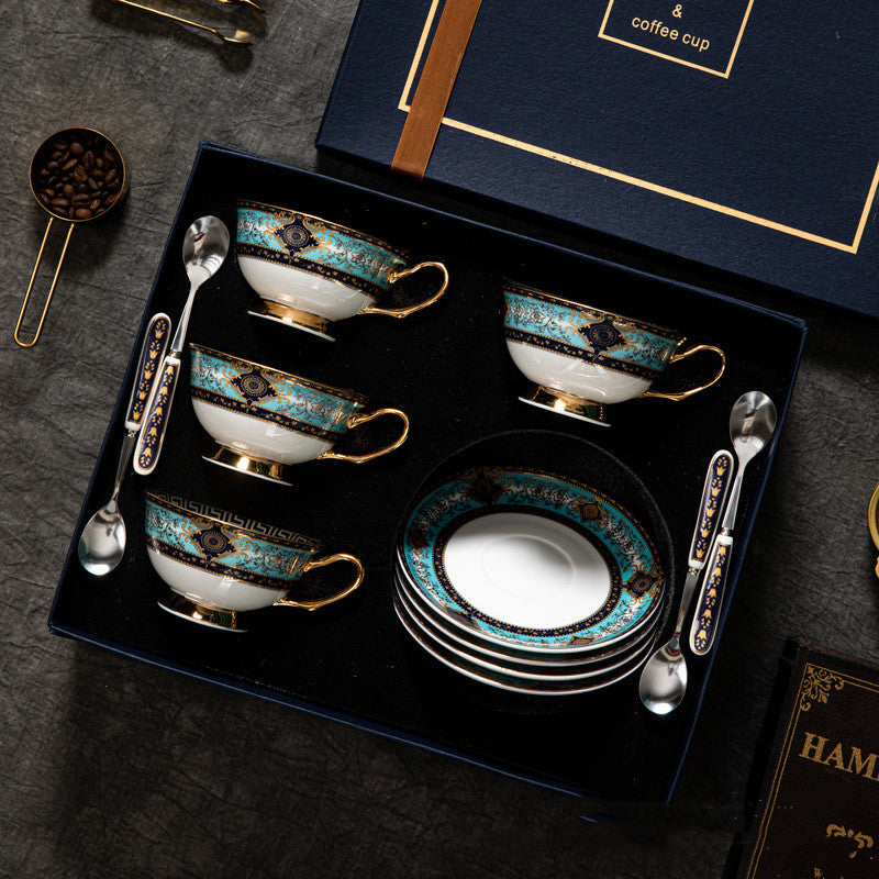 Enjoy this European Greek key floral tea cup and saucer sets for your morning/afternoon tea garden party. This reliably 3 pieces fine ceramic teacup make teal colors with golden floral with Greek key symbol designs ranging from simple white monochrome to bright multicolor